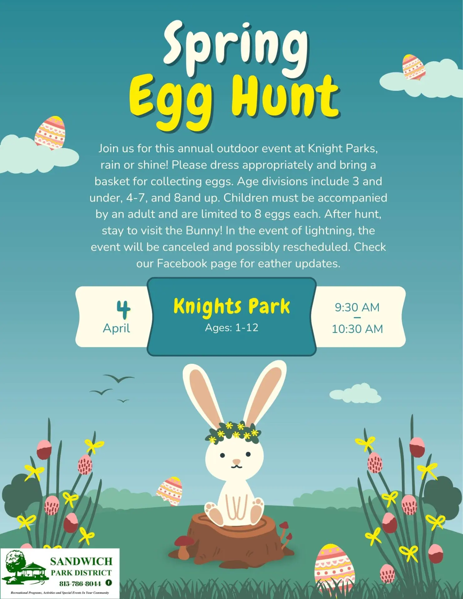 This event takes place outside at Knights Park, rain or shine! Dress appropriately and bring a basket to hold your eggs. Kids will be released to hunt eggs by age groups, with 3 and under going first, then 4 to 7 year olds, then 8 & up.